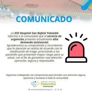 Información Importante a nuestra Comunidad En la ESE Hospital San Rafael Yolombó, nuestra prioridad es brindarte una atención segura y de calidad. Actualmente, nuestro servicio